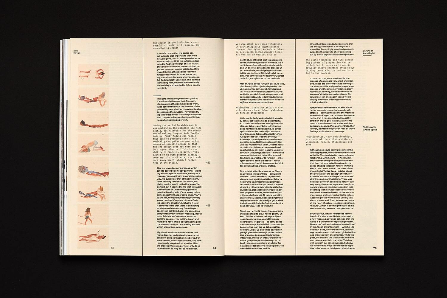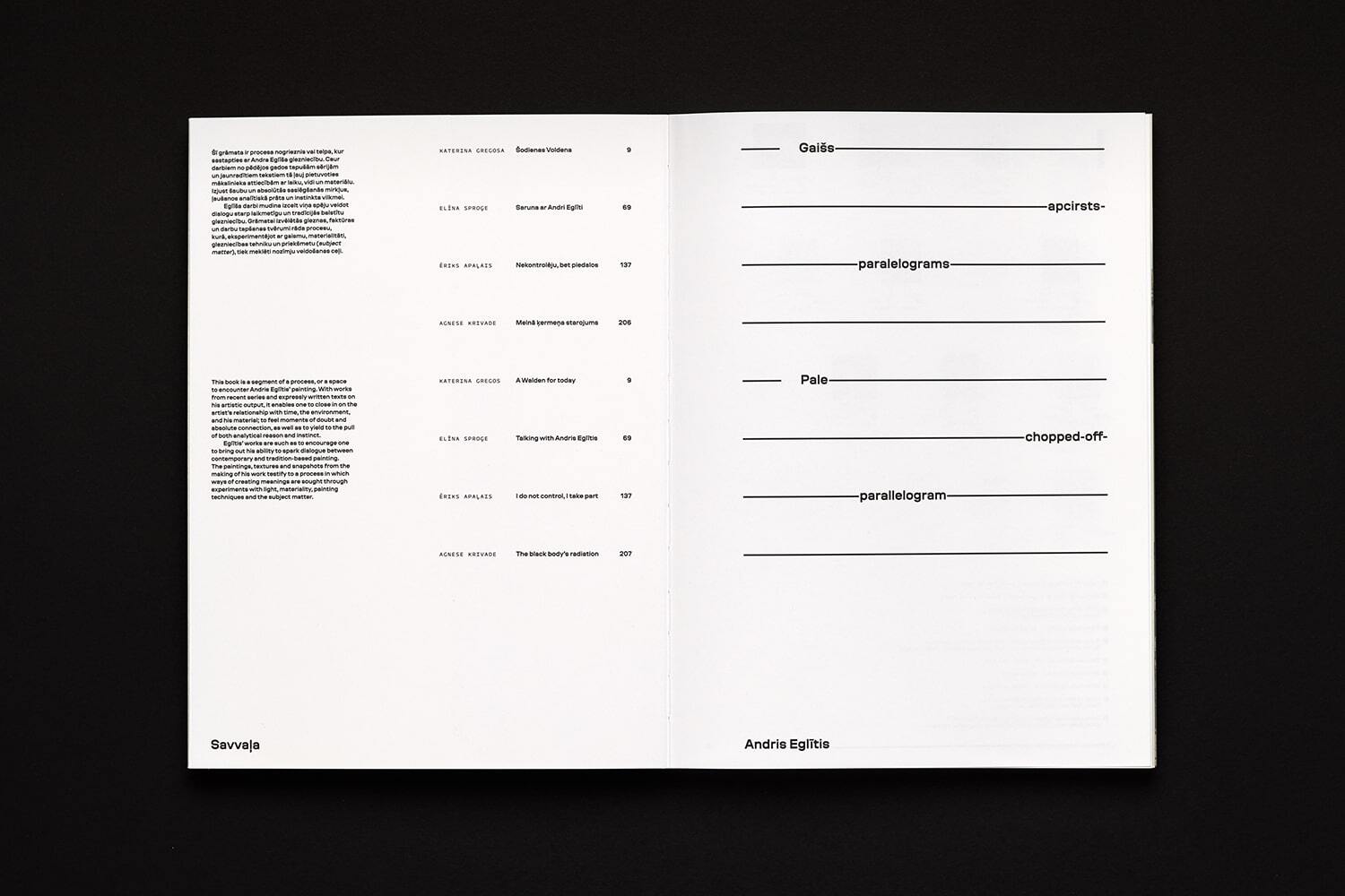 [ENG] This book is a segment of a process, or a space to encounter Andris Eglītis’ painting. With works from recent series and expressly written texts on his artistic output, it enables one to close in on the artist’s relationship with time, the environment, and his material; to feel moments of doubt and absolute connection, as well as to yield to the pull of both analytical reason and instinct. Eglītis’ works are such as to encourage one to bring out his ability to spark dialogue between contemporary and tradition-based painting. The paintings, textures and snapshots from the making of his work testify to a process in which ways of creating meanings are sought through experiments with light, materiality, painting techniques and the subject matter.