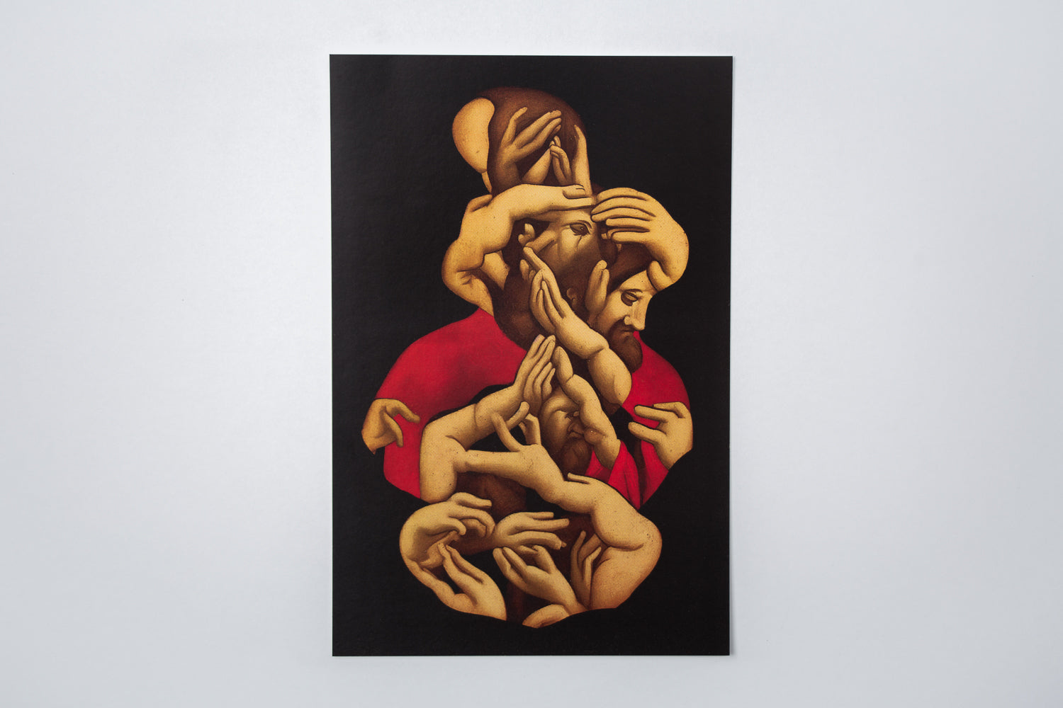 3 type of postcards from Jurģis Peters solo show "Synthetic Presence", which explores the interaction between humans and technology, reflecting on the belief in the ability of artificial intelligence to save humanity and the world.