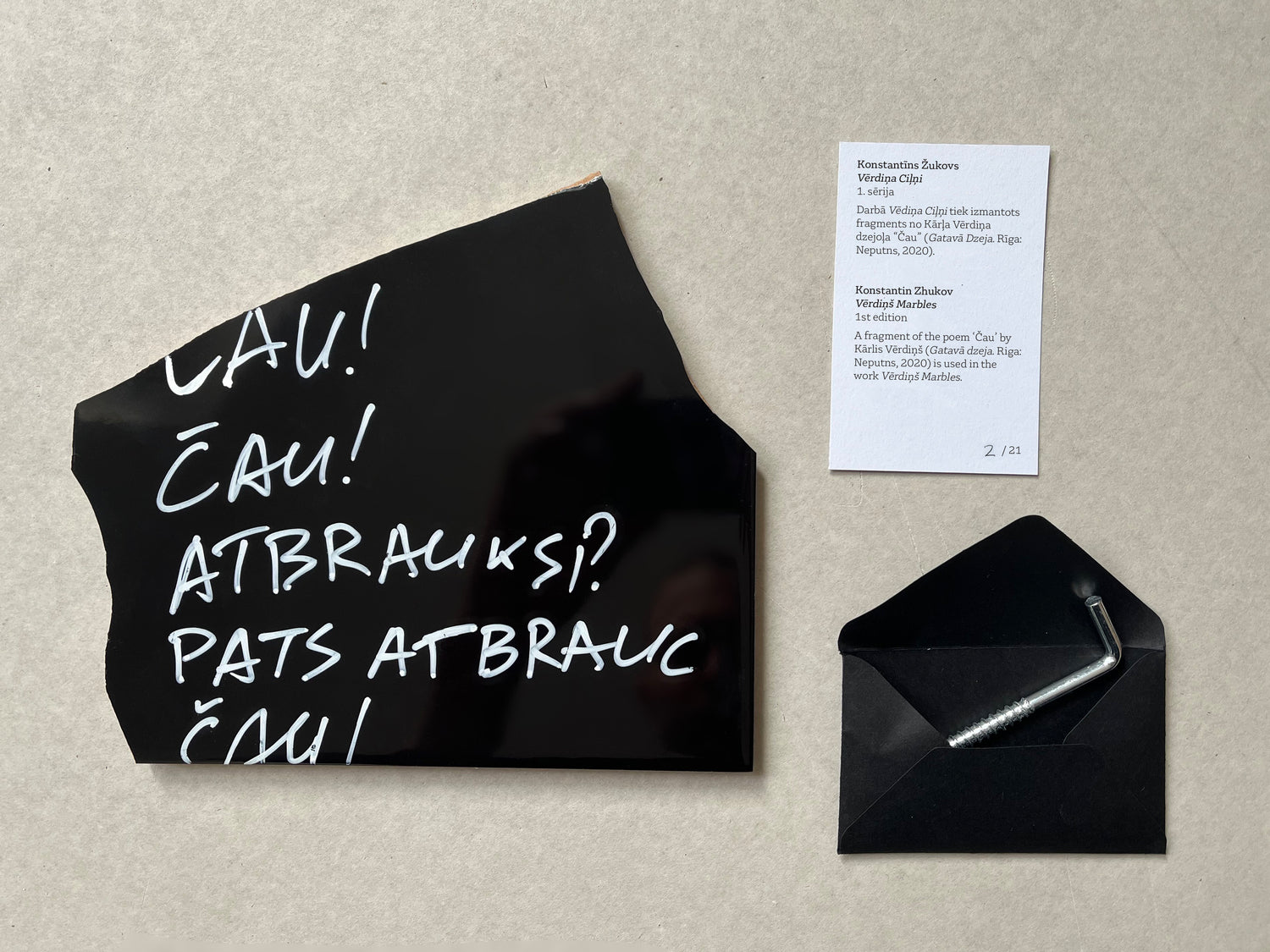 In the box: a tile with a fragment of a poem by K. Vērdiņš (on the back with a signature, edition number and soft dots to protect the surfaces), an envelope with hooks for hanging and a card with a description of nature.