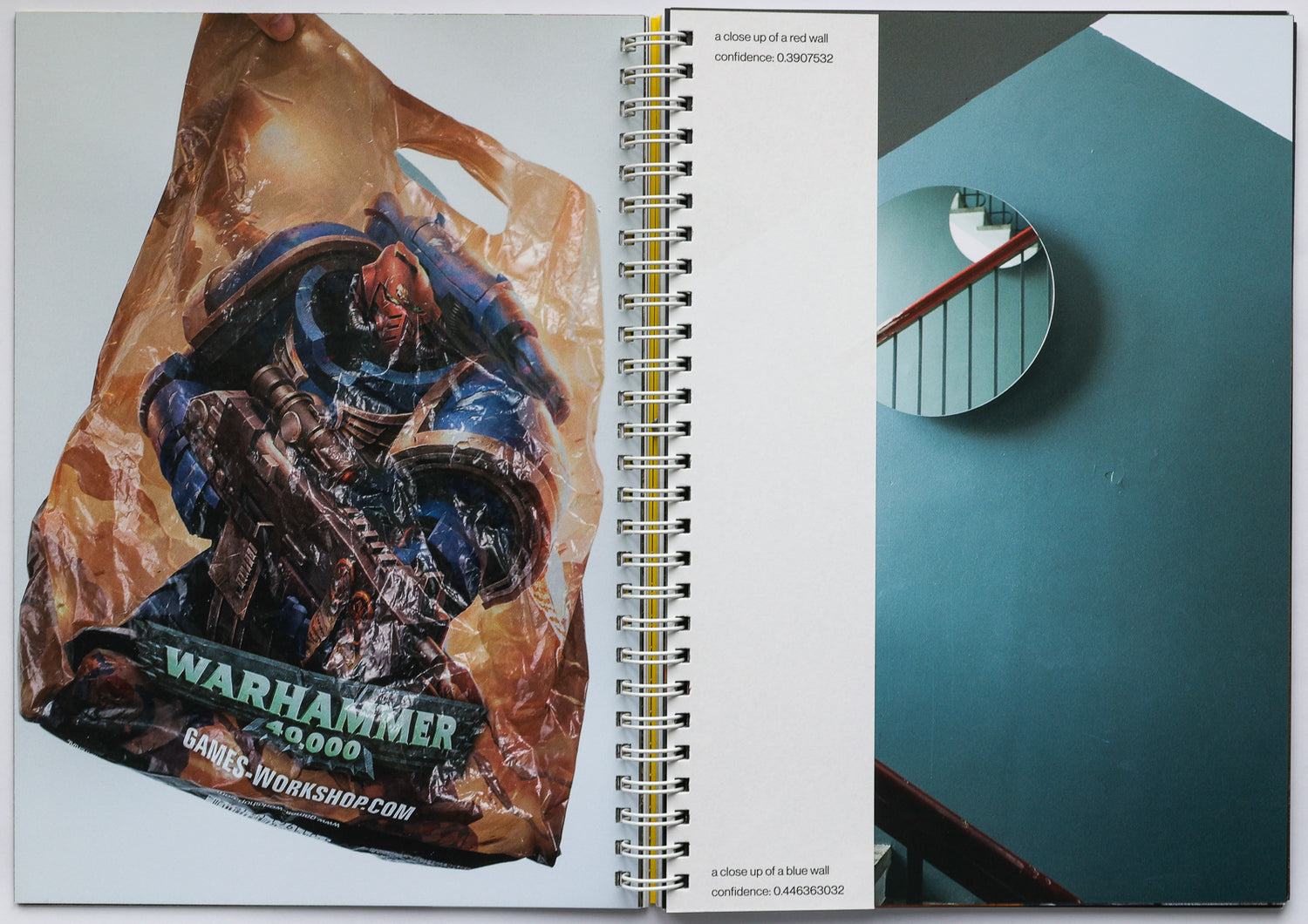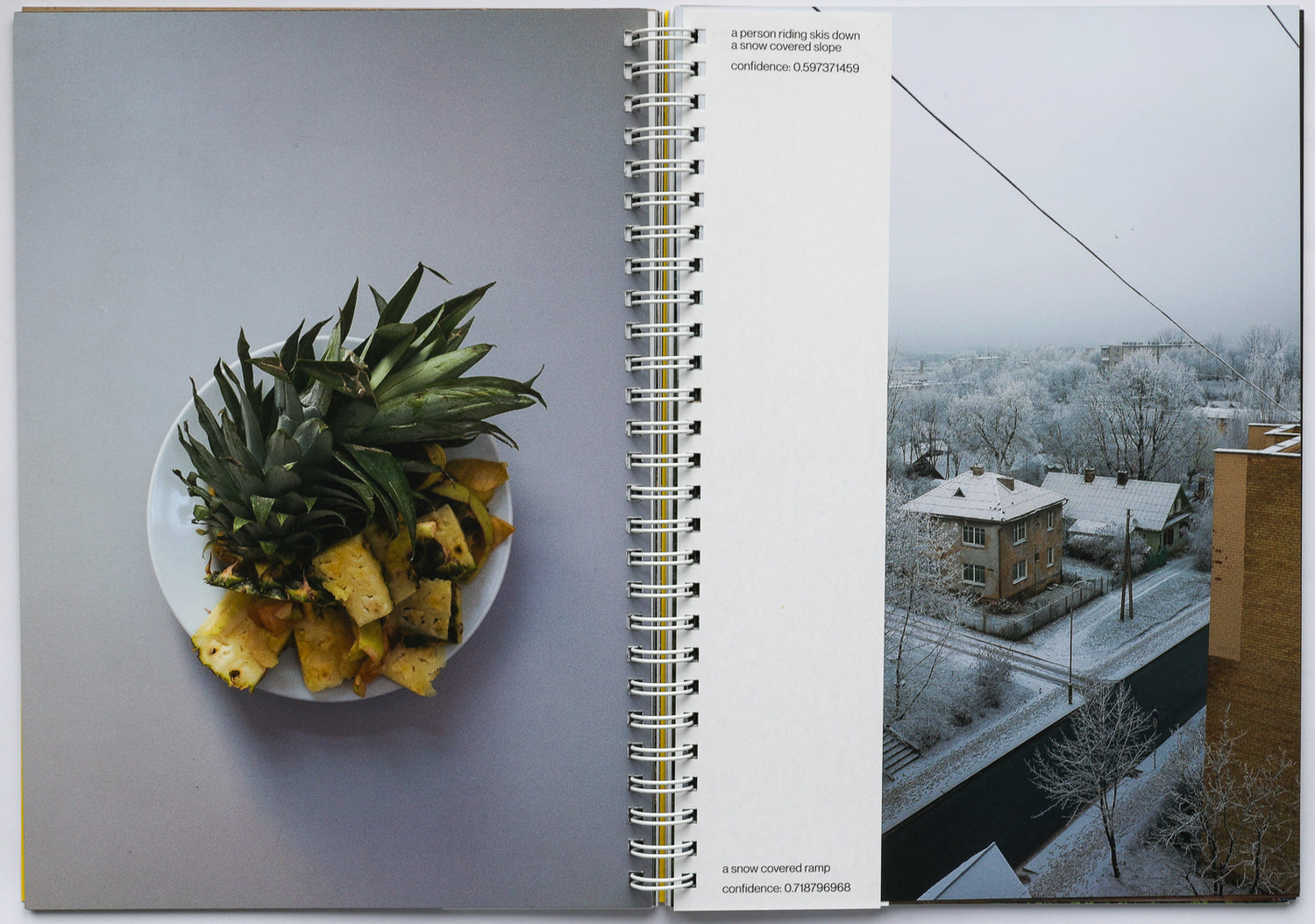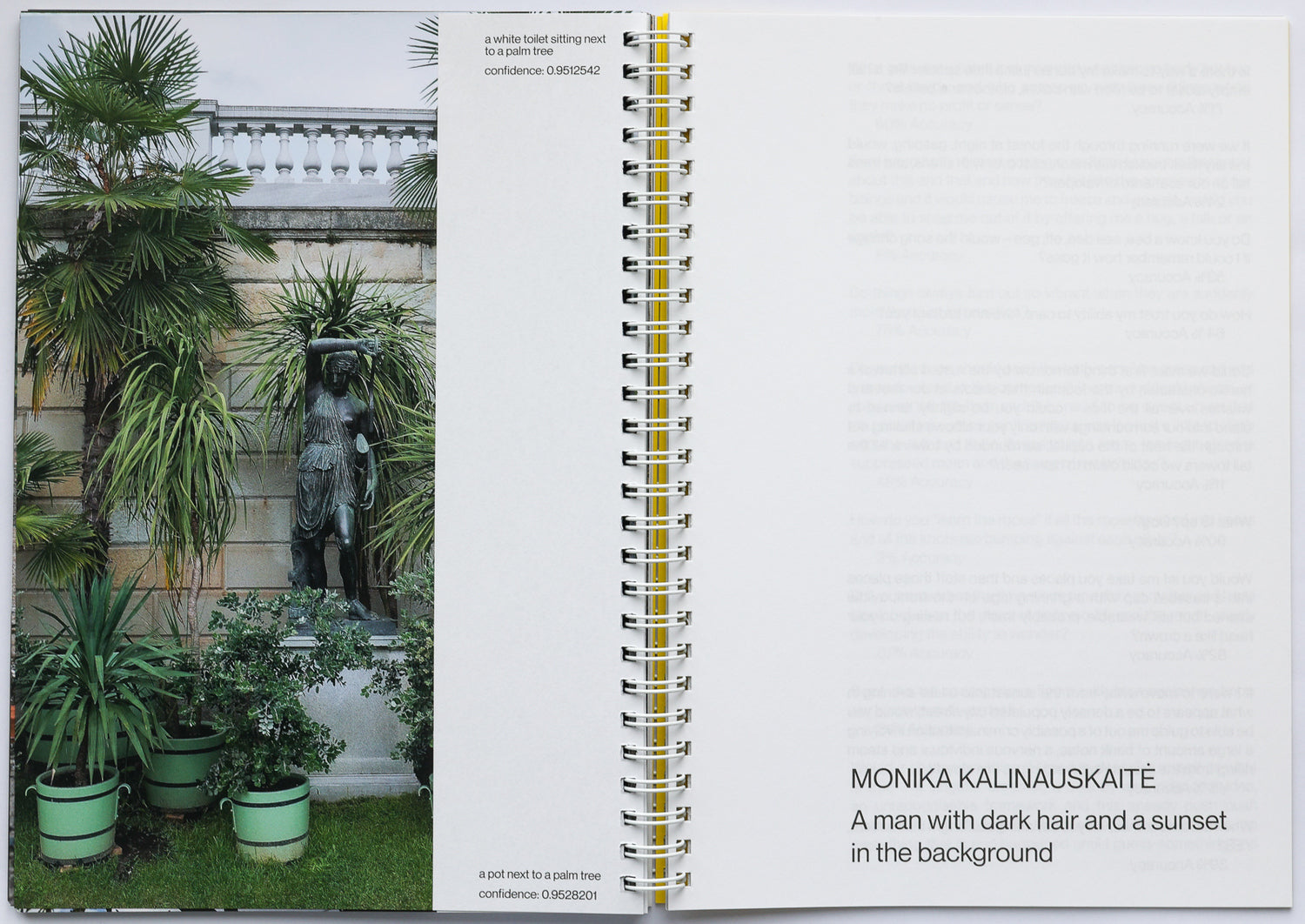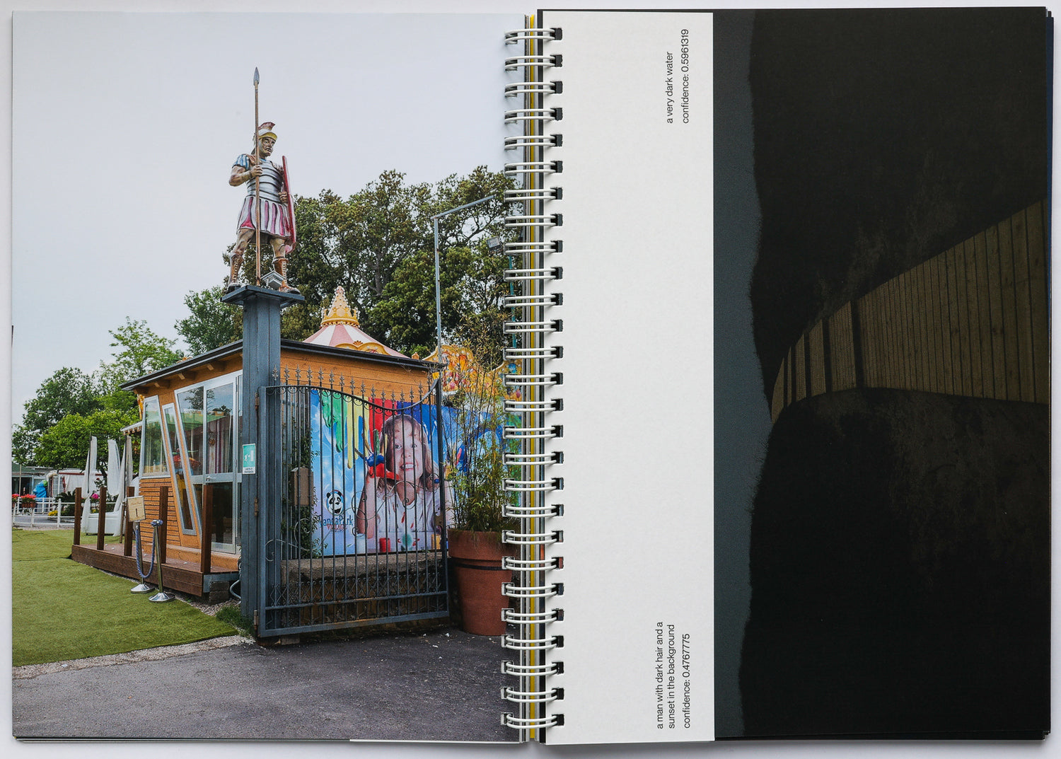 A man with dark hair and a sunset in the background is Paulius Petraitis’ exploration of machine learning and image interpretation software. Processing images taken by the artist through Microsoft’s Azure cloud processing platform, Petraitis tracked his images, their analysis and resulting captions (Azure is a system which names parts of attempts and ventures a more complex descriptive reading), in a project which explores algorithmic confidence and the machinic construction of signification.