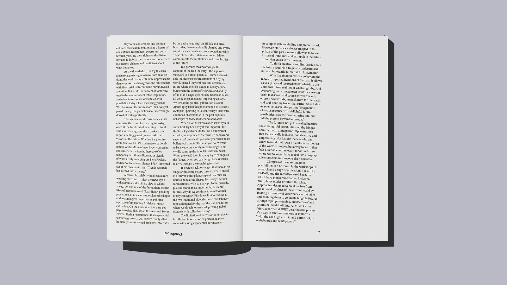 Playground is a fresh, new bi-annual magazine for imaginative minds. Featuring thought-provoking essays, engaging conversations and an assortment of “creative quickies”, it’s an honest, and at times, opinionated exploration of the creative mind and process. Packed full of smart insights and egoless advice, Playground is a must-read for those working in, or curious about, Europe’s vibrant culture and creative industries.