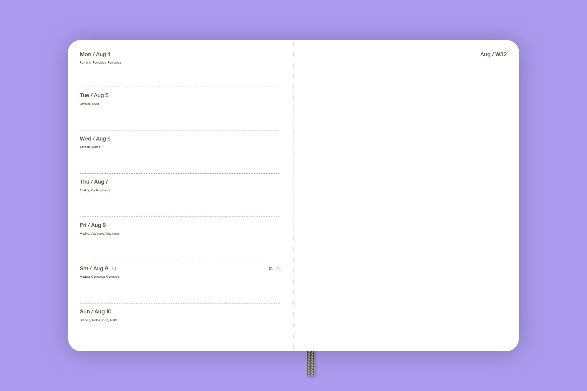 - 53 weekly openings with space for notes, international holidays, Latvian name days;